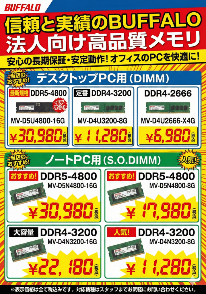 当店では現在、品質と信頼性に定評のあるBUFFALO(バッファロー)社の「法人向けパッケージ」メモリを推奨・販売しております。